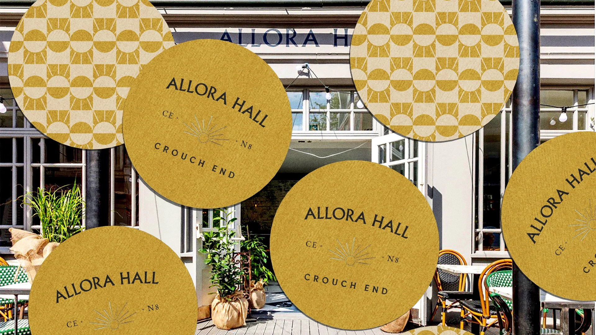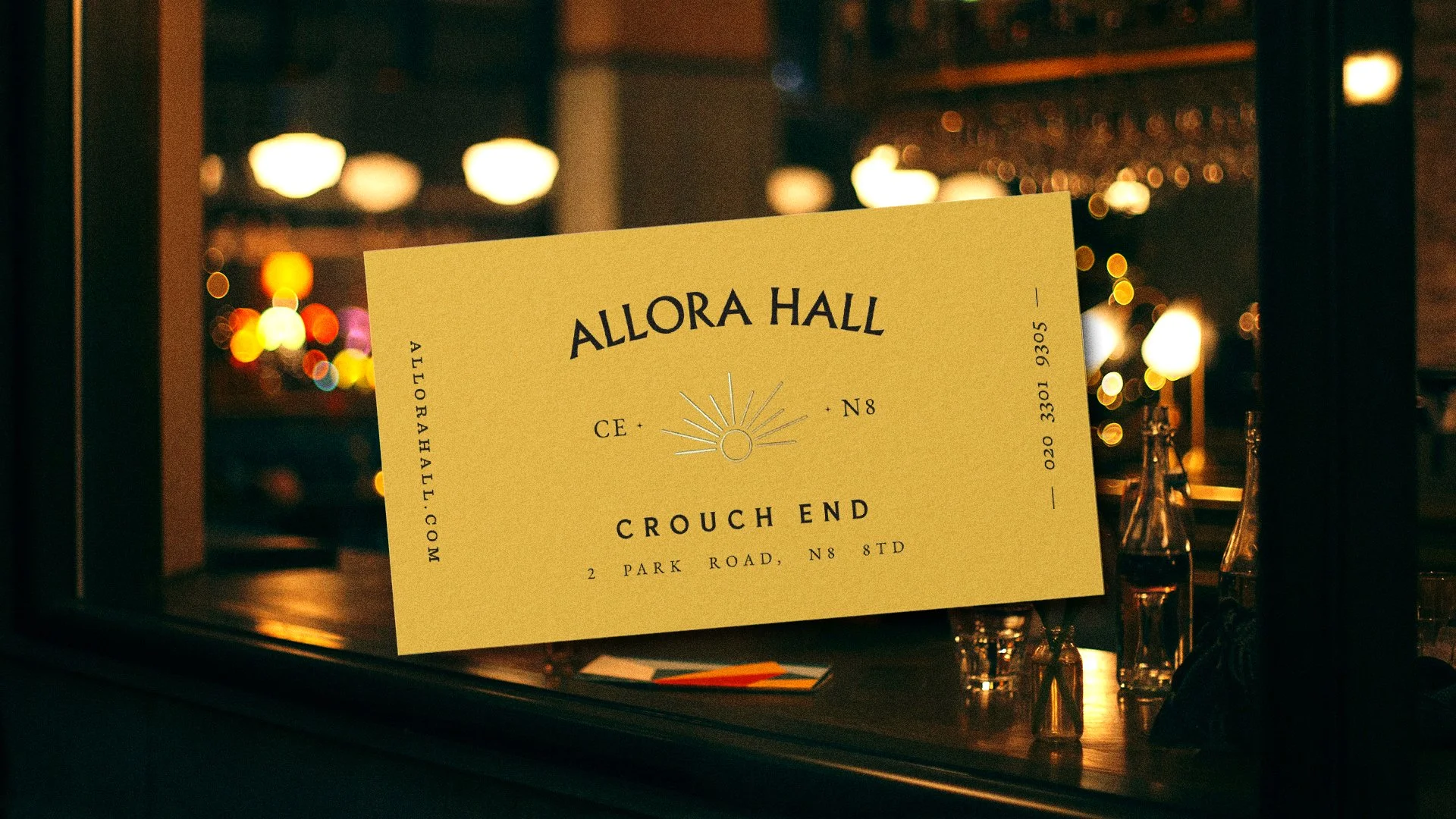 The typographic identity draws directly from this era. An etched-style logo references the engraved detailing found on buildings of the time, sitting proudly at the top of a stacked typographic arrangement inspired by late Victorian signage. At the heart of the lock-up, we developed a distinctive sun motif to act as a shorthand brand mark for the bar and restaurant. The rising sun symbolises both the start of the day and a glowing beacon at the centre of the town by night – reflecting the venue’s day-to-night offer, from breakfast and hot-desking through to evening cocktails.
