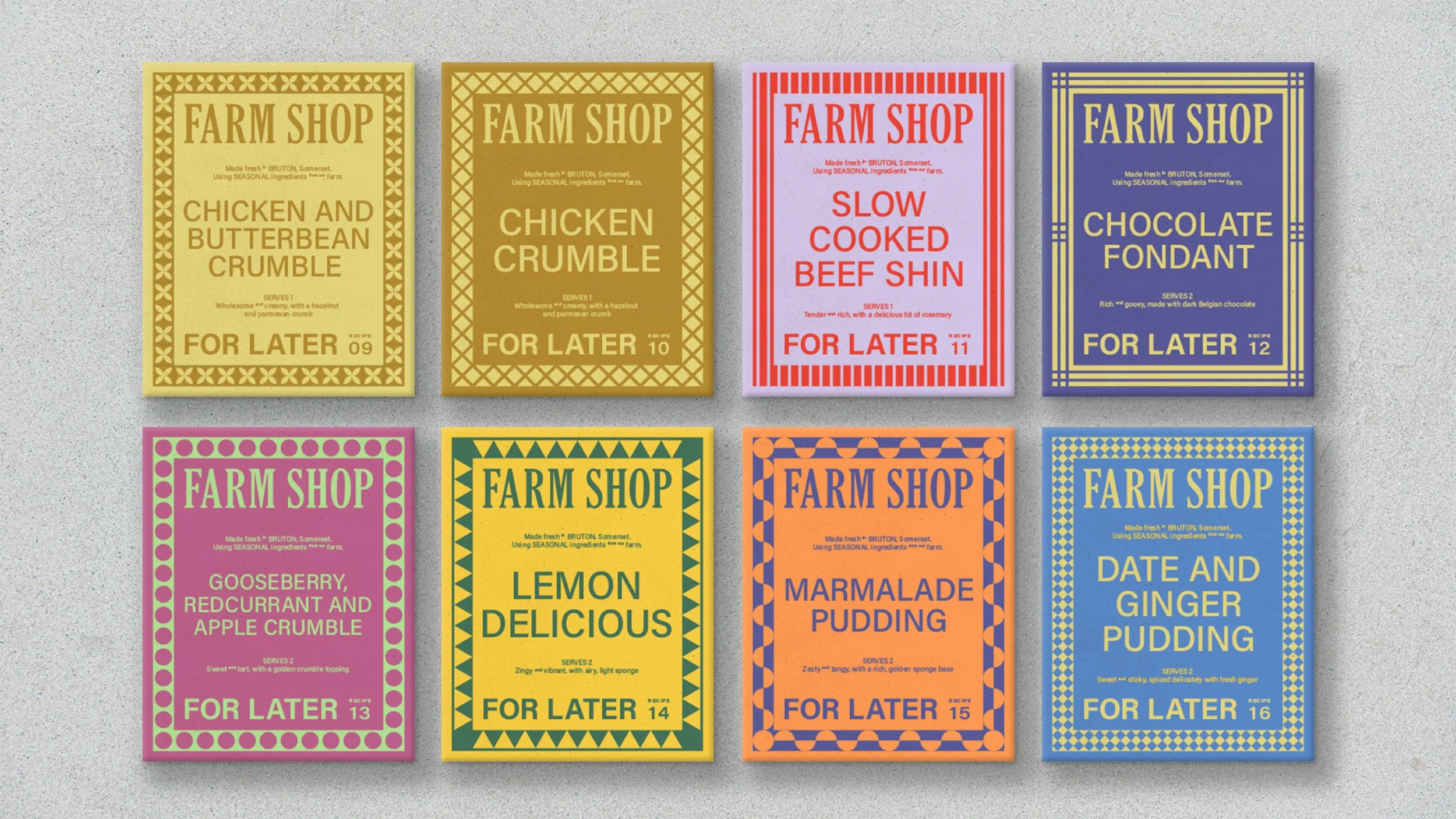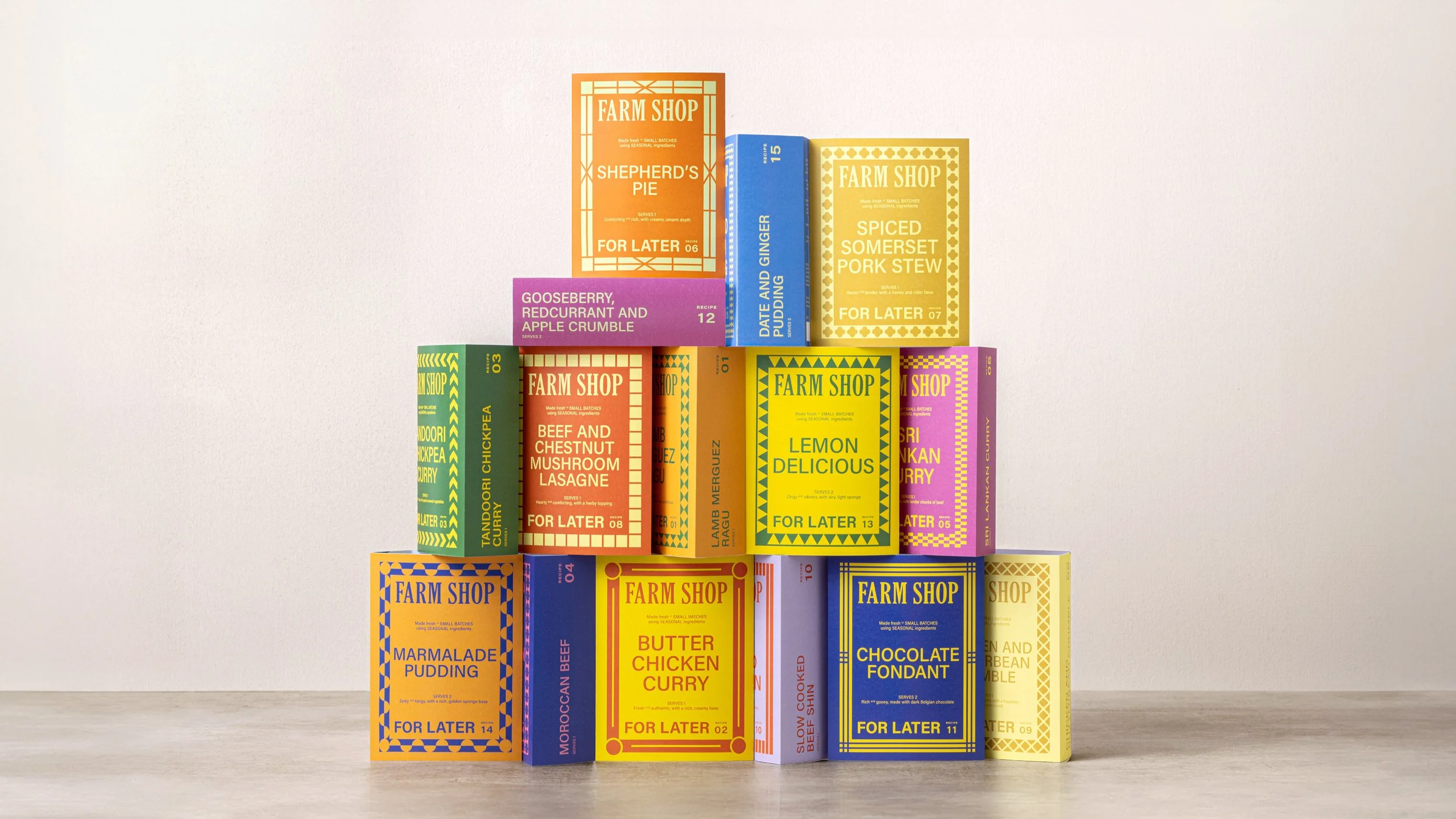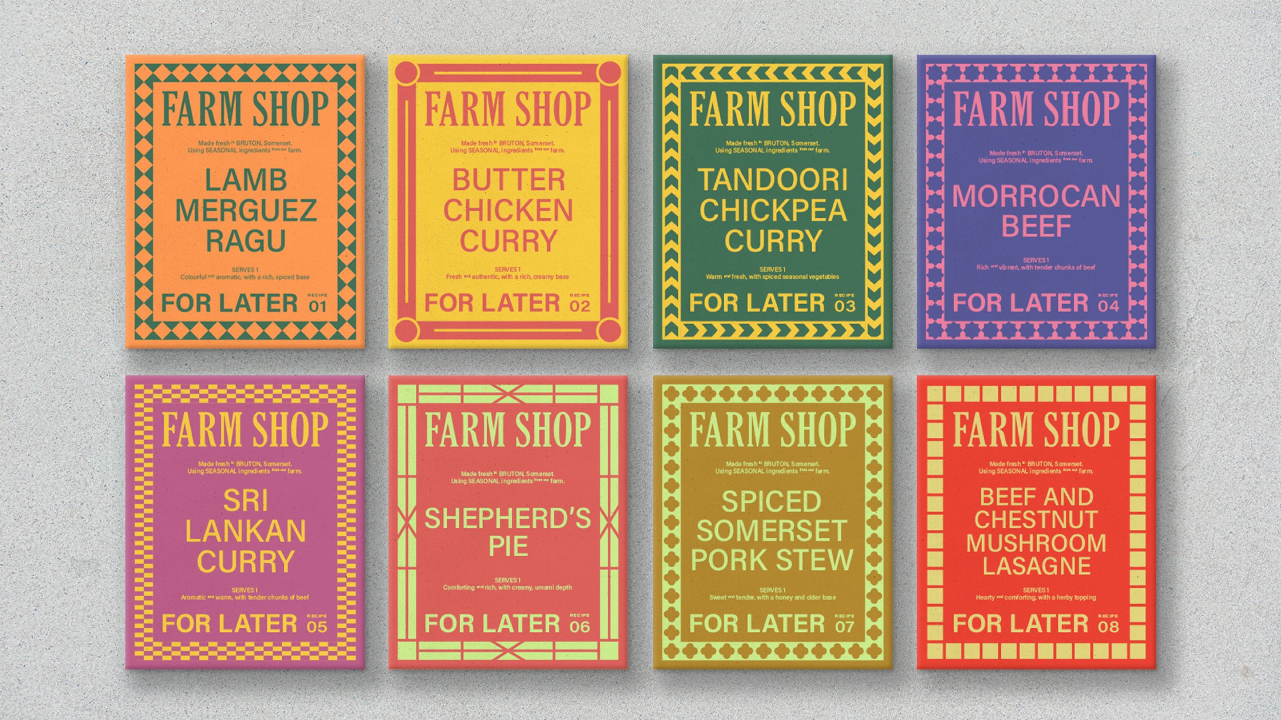 Following the Farm Shop brand refresh, we reimagined the packaging for their gourmet ready-meal range. Created by the chef at Roth Bar & Grill in Somerset, the dishes combine global inspiration with exceptional farm produce. Bold typography, vibrant colours and bespoke patterns bring the range to life, creating a distinctive system that elevates the at-home dining experience.